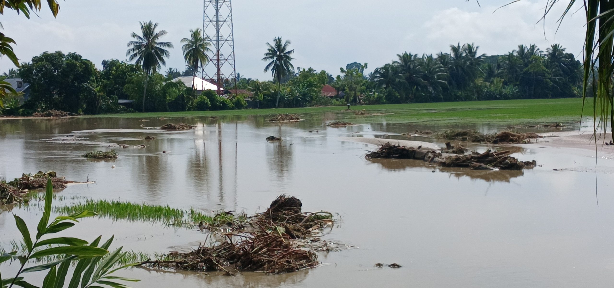 Puluhan hektar sawah di Desa Balinggi Jati rusak diterjang banjir akibat tanggul jebol, Selasa (19/8/2025). Foto – Aswadin.