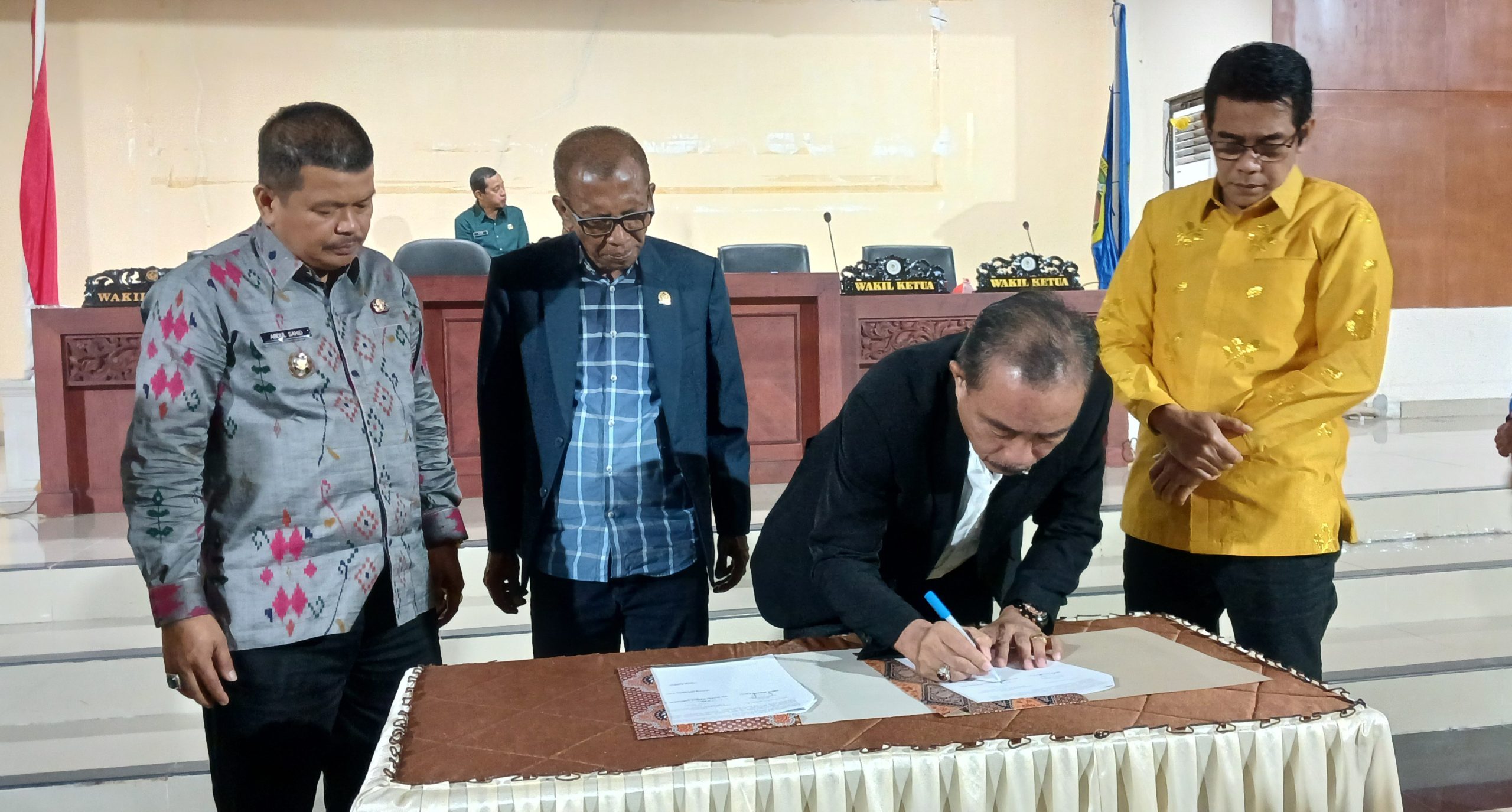 Ketua DPRD Parigi Moutong, Alfres Tonggiroh menandatangani berita acara persetujuan RPJMD disaksikan Bupati, Wakil Bupati dan Wakil Ketua DPRD, pada Rapat Paripurna, Kamis (21/8/2025), malam. Foto – Aswadin.