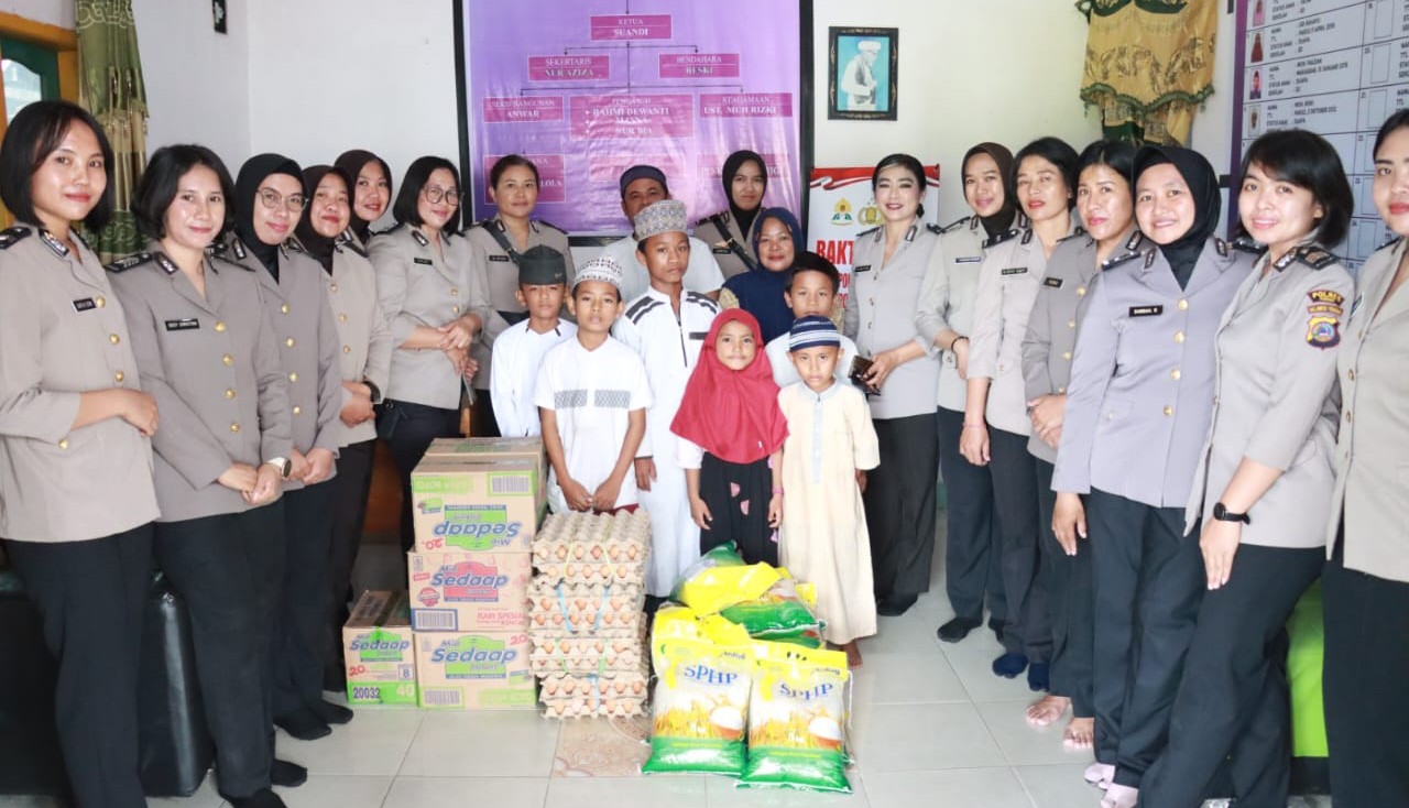 Dalam kesempatan itu, Polwan membagikan sembako, perlengkapan harian, serta memberikan perhatian dan kasih sayang kepada anak-anak panti.