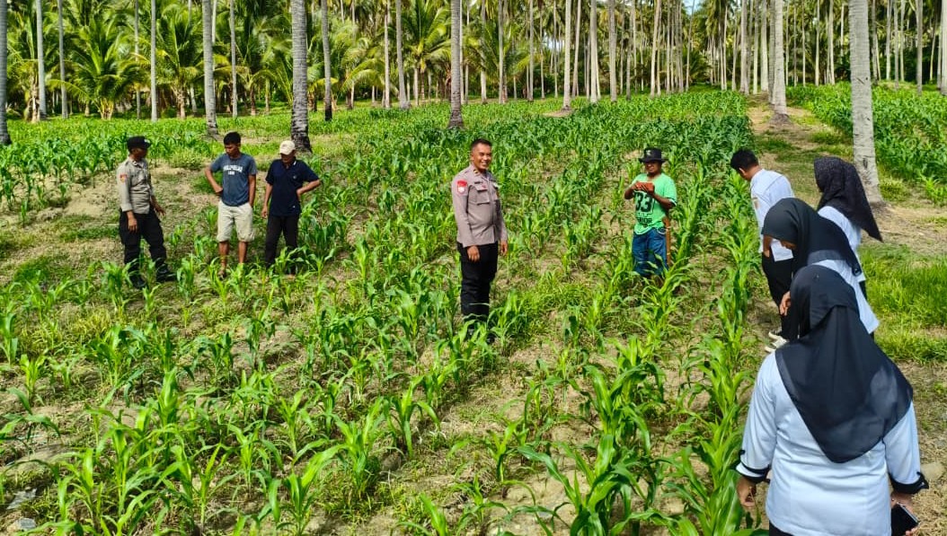 Kapolsubsektor Mepanga, Ipda Yayang Lucky bersama bersama Bhabinkamtibmas Desa Ogobayas tinjau lokasi pertanian jagung di Desa di Dusun 2 Desa Ogobayas, Selasa (2/9/2/2025).