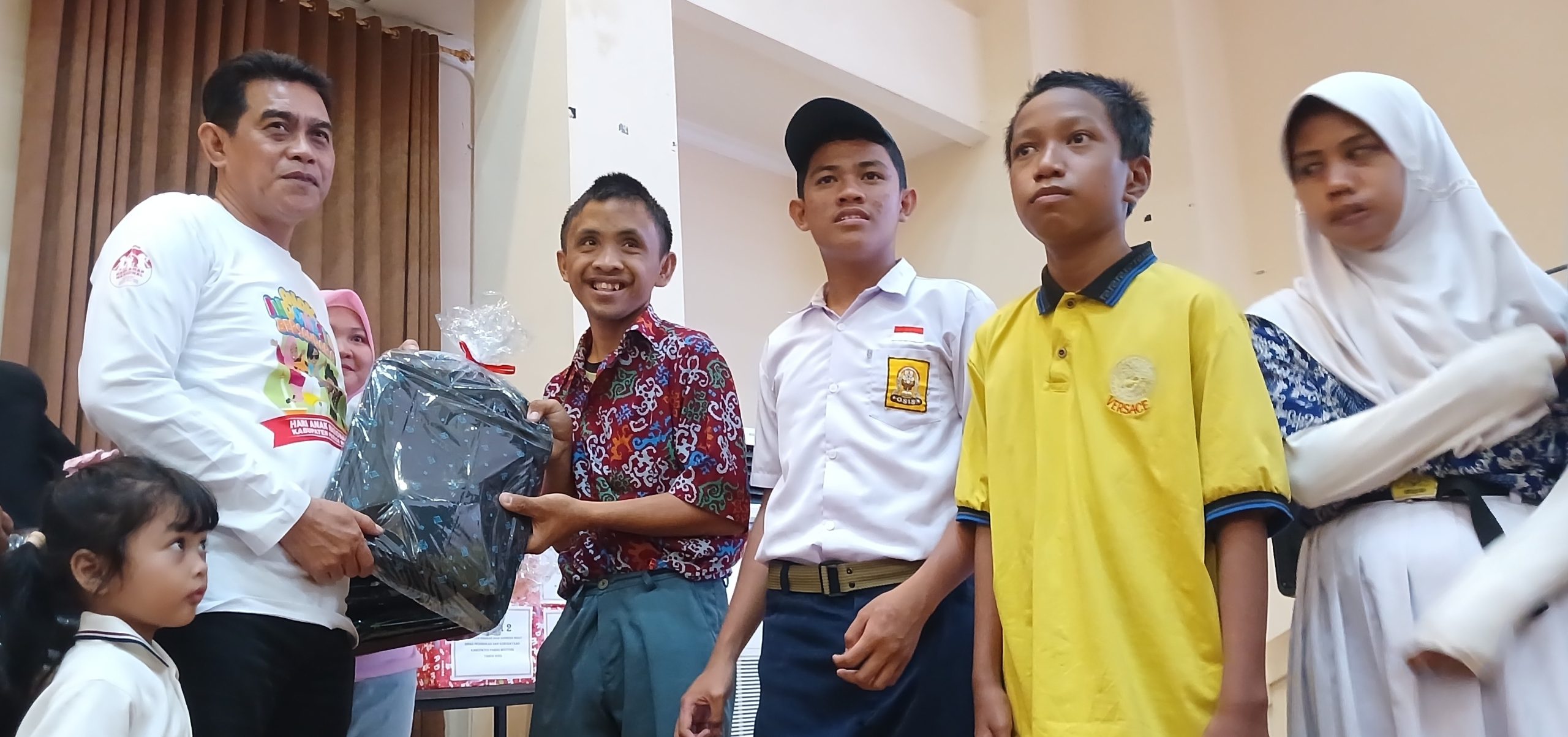 Bupati Parigi Moutong, Erwin Burase menyerahkan hadiah kepada sejumlah siswa dari SLBN di momen Hari Anak Nasional, Jumat (12/9/2025). Foto – Aswadin.