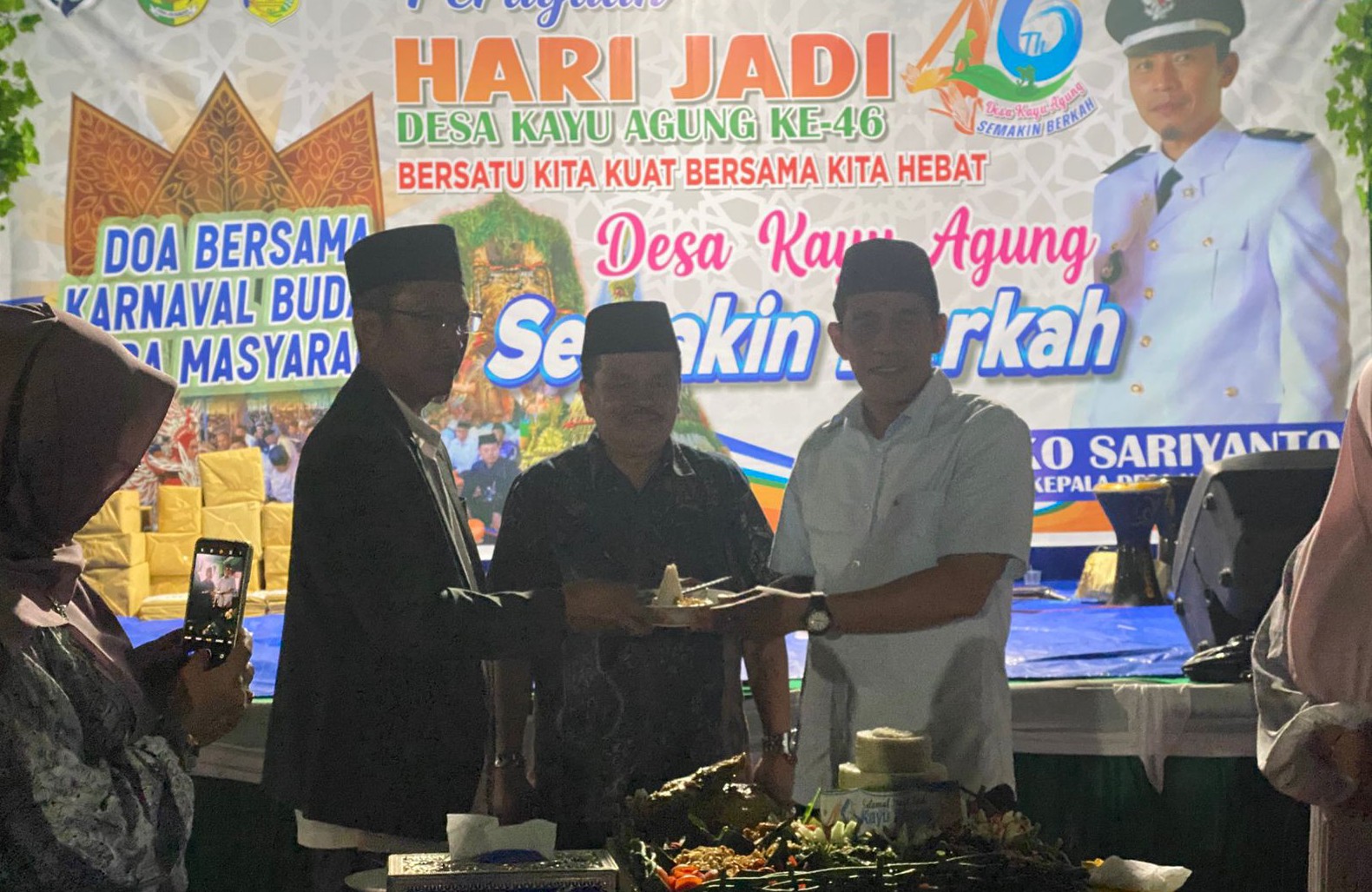 Sebagai penutup, Bupati dan Wakil Bupati melakukan pemotongan tumpeng sebagai bentuk rasa syukur bersama masyarakat Desa Kayu Agung.