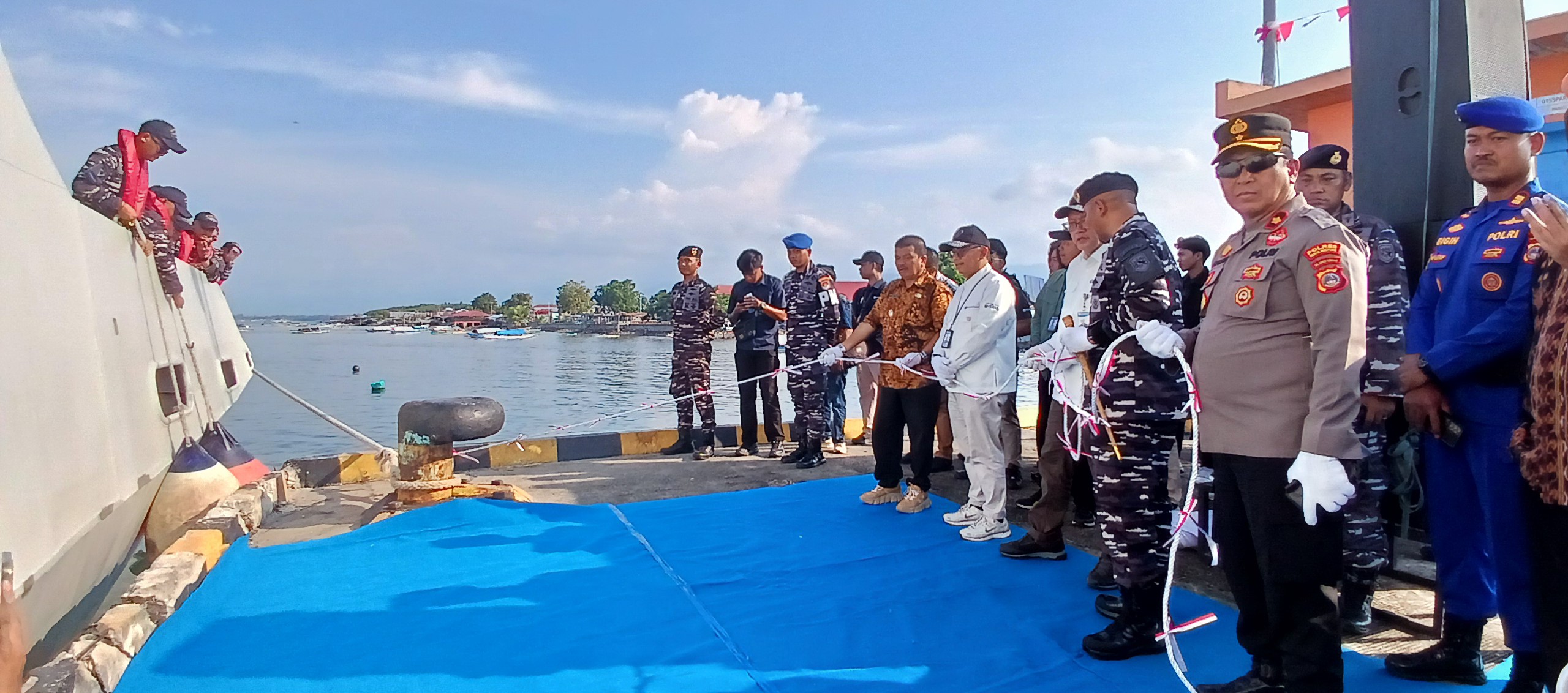 Wakil Bupati Parigi Moutong, Abdul Sahid bersama pihak terkait saat melepas tali tambat pemberangkatan KRI Lumba-Lumba ke pulau 3T di Sulteng. (Foto – Aswadin).