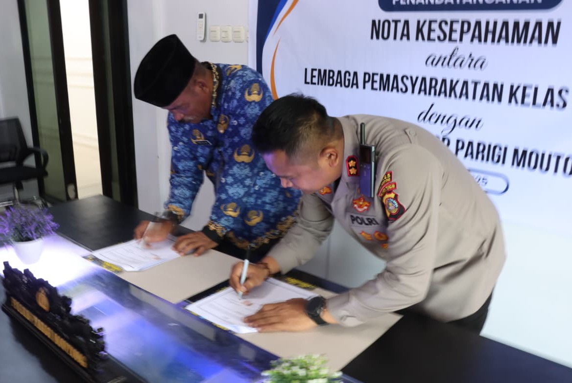 Kapolres Parigi Moutong, AKBP Dr. Hendrawan Agustian Nugraha, dan Kalapas Kelas III Parigi, Fentje menandatangani dokumen kerjasama.