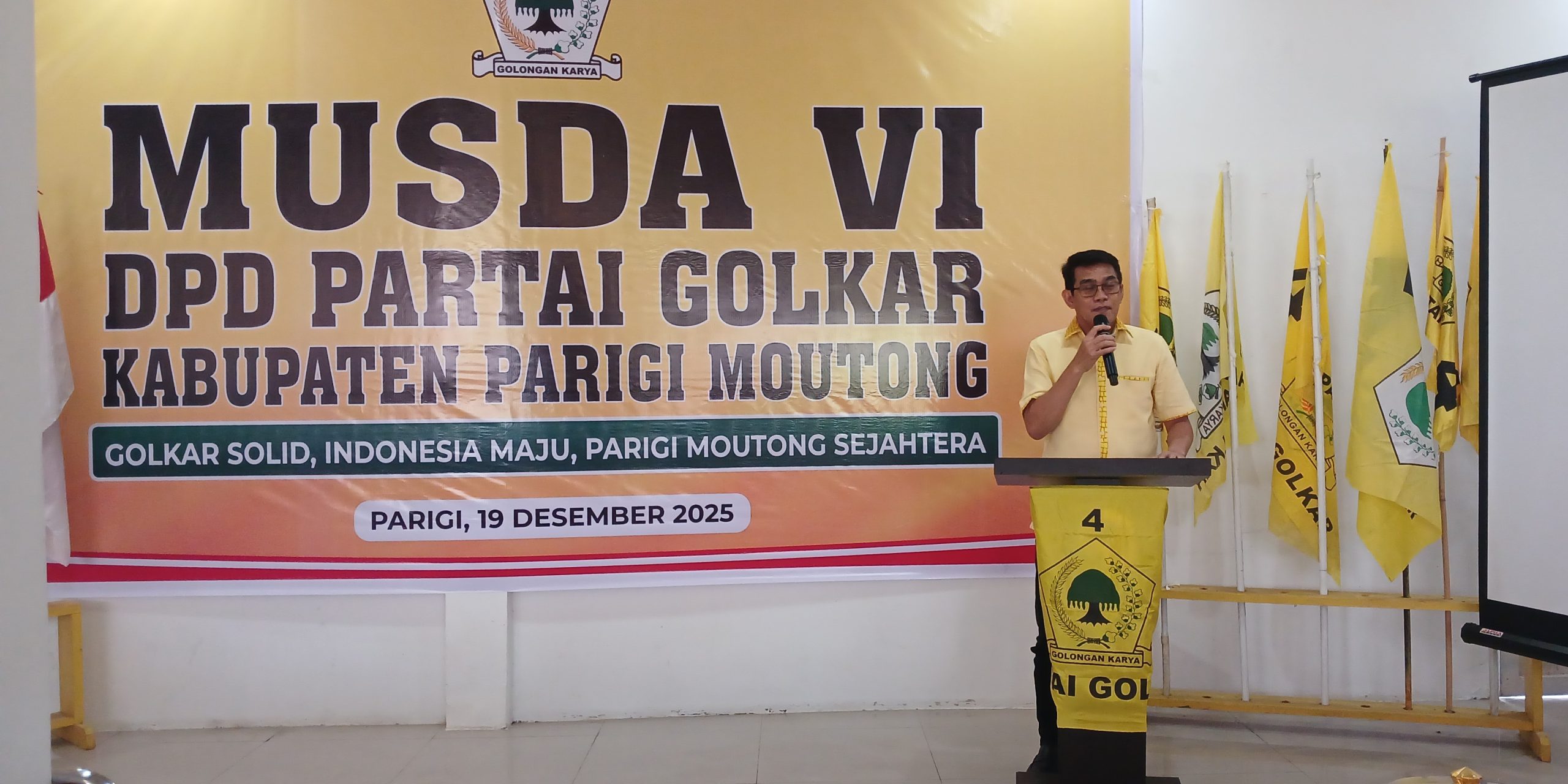 Bupati Parigi Moutong, Erwin Burase saat menghadiri Musda VI DPD Partai Golongan Karya, di Parigi, Jumat (19/12/2025). Foto – Aswadin.