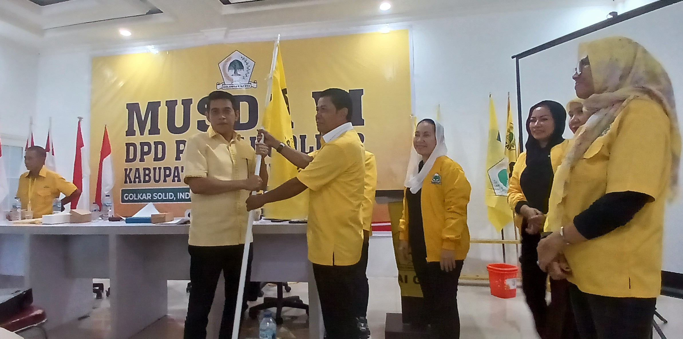 Erwin Burase terpilih menjadi Ketua DPD Partai Golongan Karya menerima bendera pataka usai ditetapkan, di Parigi Jumat (19/12/2025). Foto — Aswadin.