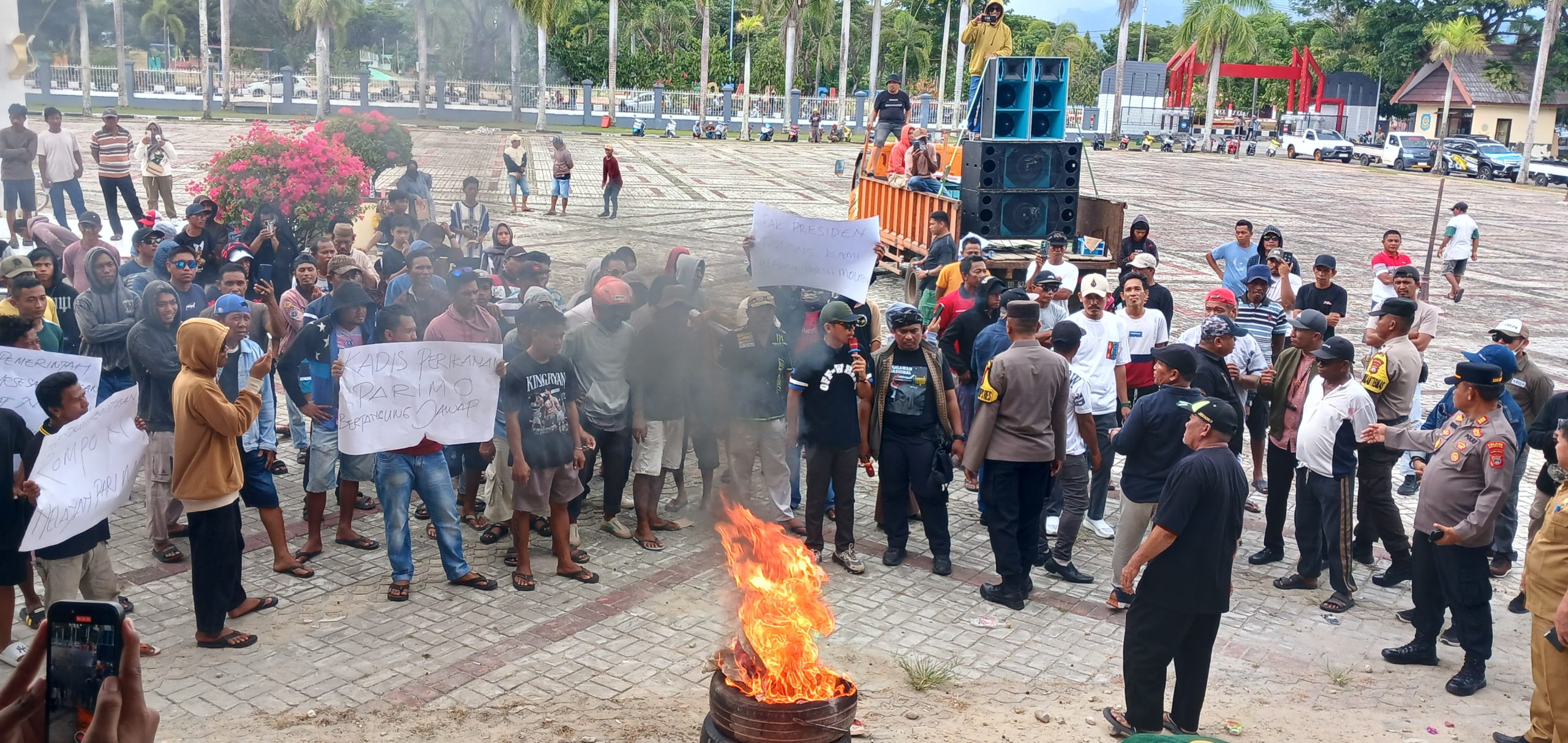 Ratusan massa aksi yang tergabung dalam himpunan nelayan Teluk Tomini Parigi Moutong melakukan aksi damai di halaman Kantor Bupati, Senin (22/12/2025). Foto – Aswadin.
