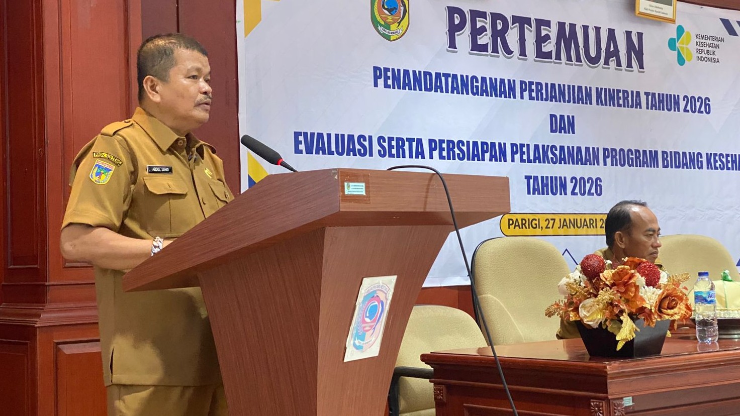 Parigi Moutong, – Wakil Bupati Parigi Moutong Abdul Sahid membacakan sambutan Bupati Erwin Burase, pada Penandatanganan Perjanjian Kinerja Bidang Kesehatan Tahun Anggaran 2026 di Aula Lantai II Kantor Bupati, Selasa (27/1/2026).