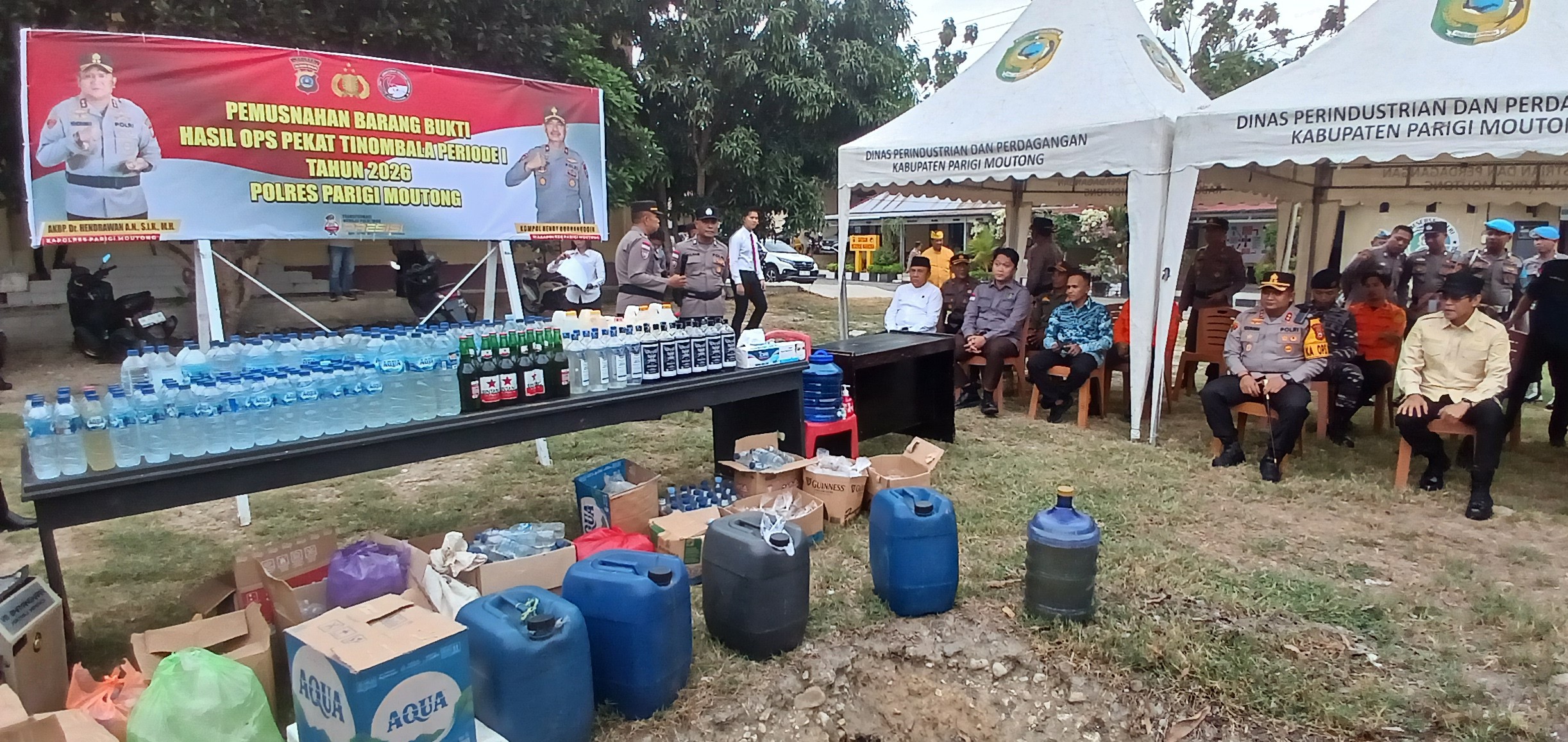 Parigi Moutong, PUSATWARTA.ID— Polres Parigi Moutong memusnahkan ratusan liter minuman keras (miras) hasil sitaan dalam kegiatan Operasi Pekat I Tinombala 2026.