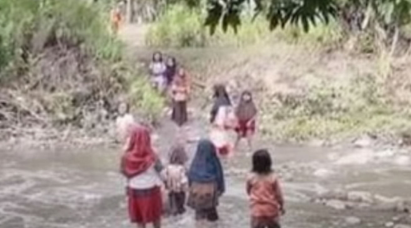 Dalam video yang beredar, tampak para siswa tetap berangkat sekolah meski harus menghadapi derasnya arus sungai, bahkan saat hujan turun.