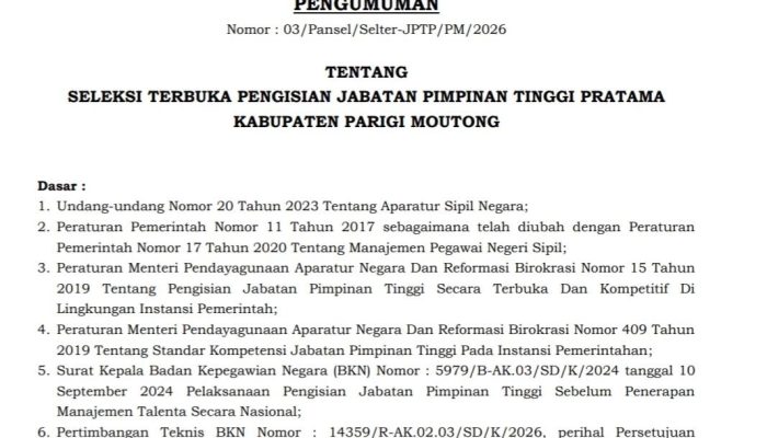 Parigi Moutong, PUSATWARTA.ID– Pemerintah Kabupaten Parigi Moutong resmi membuka seleksi terbuka pengisian Jabatan Pimpinan Tinggi (JPT) Pratama tahun 2026.